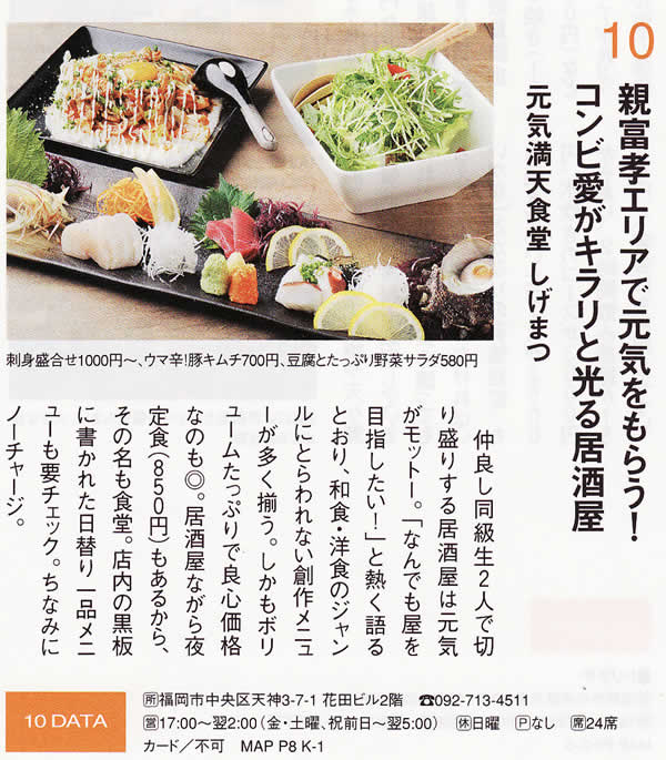 元気満天食堂 しげまつ 2008.4月26日OPEN 所在地:福岡市中央区天神3-7-1 花田ビル2階 電話番号:092-713-4511 形態:居酒屋 坪数:12坪 席数:24席 営業時間:平日17時から2時 金.土.祝前日17時から5時 日曜17時から0時