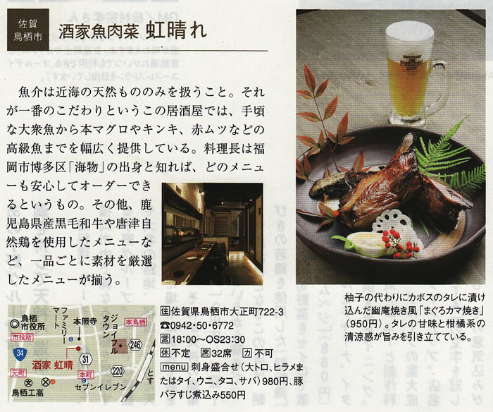酒家 魚 肉 菜 虹晴れ 2008.12月04日グランドOPEN予定 所在地:佐賀県鳥栖市大正町722-3 電話番号:0942-50-6772 形態:居酒屋 坪数:21坪 席数:46席 営業時間:18時から0時 OS23時30分 URL:食べログ