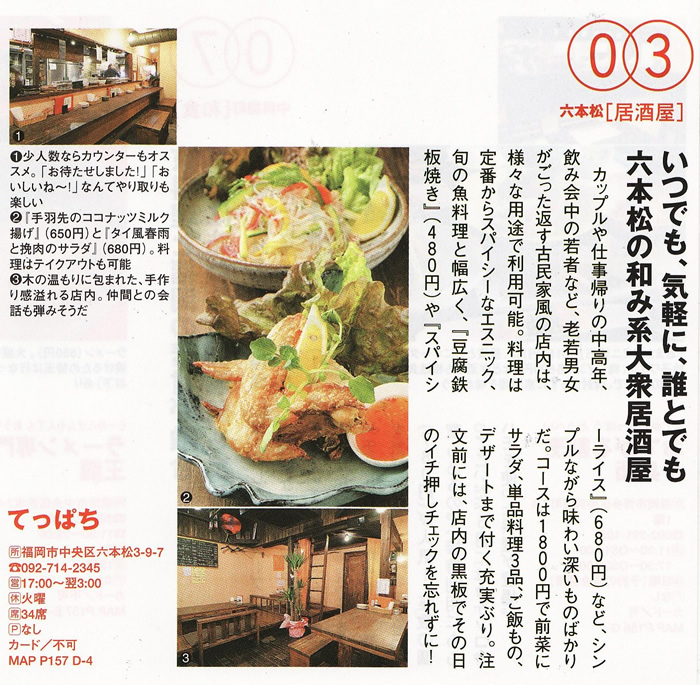 てっぱち 2009.01月12日OPEN 所在地:福岡市中央区六本松3-9 電話番号:092-714-2345 形態:居酒屋 坪数:18坪 34席 営業時間:17:00~am5:00 定休日: URL:Yahoo!グルメ!